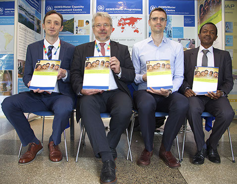 Launching the report, from left to right Kilian Christ (UNEP), Dietrich Borchardt (UFZ), Stewart Warner (UCC) and Patrick Mmayi (UNEP)